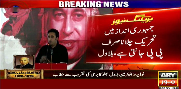 اے آر وائی نیوز کی رپورٹ کے مطابق چیئرمین پیپلزپارٹی بلاول بھٹو نے ذوالفقار علی بھٹو کی برسی کی تقریب سے خطاب کرتے ہوئے کہا کہ سی ای سی اجلاس میں استعفوں کے آپشن پر مشاورت کریں گے، عمران خان حکومت سے ہر چیز کا حساب لیں گے۔