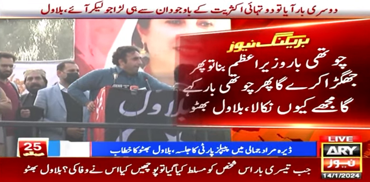 بلاول بھٹو زرداری نے کہا کہ جب پہلی بار اُس شخص کو مسلط کیا گیا تو اس نے بلوچستان کے عوام کے حق پر ڈاکہ مارا، دوسری بار مسلط کیا تو پھر بلوچستان کے عوام کے حق پر ڈاکہ مارا، تیسری بار مسلط کیا تو پوچھیں کیا اس نے وفا کی؟ تین بار ناکام شخص کو ہم کیوں چوتھی بار مان لیں؟