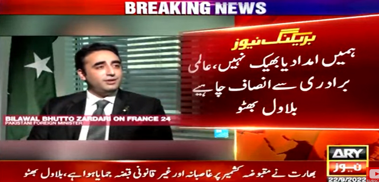 وزیر خارجہ بلاول بھٹو نے کہا ہے پاکستان میں سیلاب عالمی تباہی ہے اس کا ادراک بھی عالمی سطح پر ہونا چاہیے ہمیں دنیا سے امداد یا بھیک نہیں بلکہ انصاف چاہیے۔