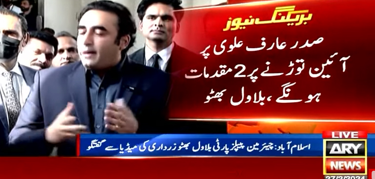 اے آر وائی نیوز کے مطابق پاکستان پیپلز پارٹی کے چیئرمین بلاول بھٹو زرداری نے اسلام آباد میں میڈیا سے گفتگو کرتے ہوئے کہا ہے کہ آئین میں لکھا ہے کہ ہر حال میں اسمبلی کا اجلاس 29 فروری تک بلانا ہے لیکن صدر عارف علوی قومی اسمبلی کا اجلاس نہ بلا کر آئین شکنی کر رہے ہیں اگر وہ اپنی آئینی ذمے داری پوری نہیں کرتے تو یہ ذمے داری اسپیکر راجا پرویز اشرف کریں گے، اس سے حکومت سازی کے عمل میں کوئی فرق نہیں پڑے گا۔