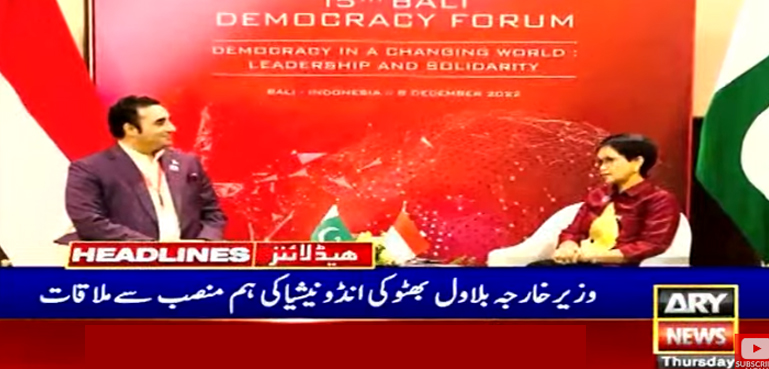 وزیر خارجہ بلاول بھٹو زرداری نے انڈونیشیا ہم منصب سے ملاقات کی جس میں دونوں ممالک کے مابین مشترکہ وزارتی کمیشنکے قیام کیلیے مفاہمت نامے پر دستخط کیے۔