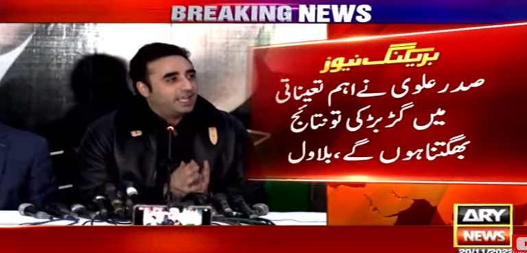 اے آر وائی نیوز کے مطابق وزیر خارجہ بلاول بھٹو زرداری نے گزشتہ روز اسلام آباد میں پریس کانفرنس کرتے ہوئے صدر مملکت ڈاکٹر عارف علوی کو واضح الفاظوں میں دھمکی دیتے ہوئے کہا ہے کہ صدر علوی کے پاس آخری موقع ہے، اگر انہوں نے اہم تعیناتی میں گڑبڑ کرنے کی کوشش کی تو انہیں نتائج بھگتنا ہوں گے۔