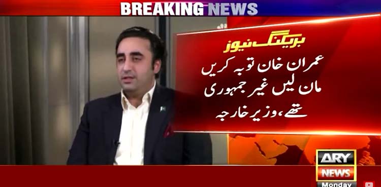اے آر وائی نیوز کے مطابق پیپلزپارٹی کے چیئرمین بلاول بھٹو نے غیرملکی میڈیا سے گفتگو کرتے ہوئے کہا کہ خان صاحب سے کہتا رہا کہ دعا کریں پیپلزپارٹی کی حکومت آئے اب بھی کہتا ہوں کہ توبہ کرو مان لو کہ غیر جمہوری تھے۔