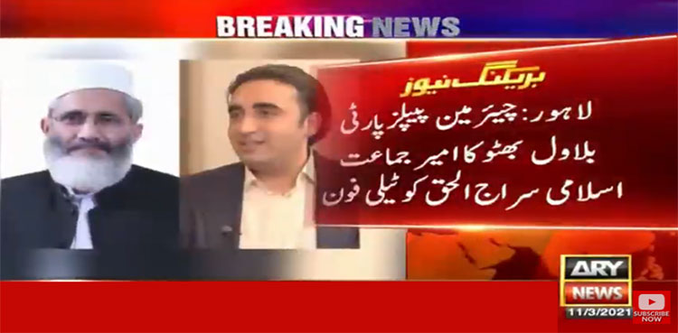 ترجمان جماعت اسلامی کے مطابق ٹیلی فونک رابطے میں دونوں رہنماؤں نے موجودہ سیاسی صورتحال پر تبادلہ خیال کیا، بلاول بھٹو نے سراج الحق سےچیئرمین سینیٹ انتخاب میں تعاون کی درخواست کی۔