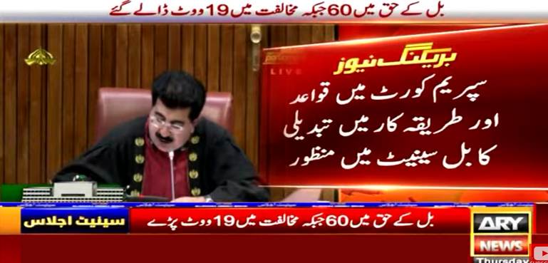 سینیٹ میں سپریم کورٹ پریکٹسز اینڈ پروسیجر بل 2023 کو کثرت رائے سے منظور کر لیا گیا ہے بل کے حق میں 60 جب کہ مخالفت میں 19 ووٹ پڑے۔