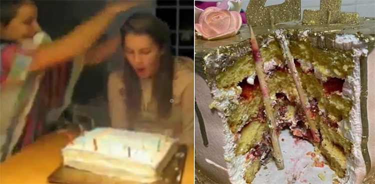 جب خاتون کا منہ کیک باہر آیا تو ایک لکڑی کا ٹکڑا بالکل آنکھ کے قریبی حصے میں لگا ہوا دیکھ ‏کر سب کے ہوش اڑ گئے۔
