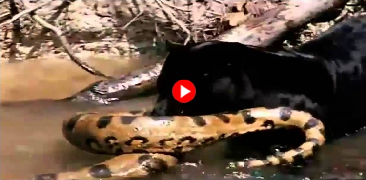 انٹرنیٹ پر وائرل ویڈیو میں دیکھا جاسکتا ہے کہ بلیک پینتھر نے پانی میں موجود دیوقامت اثدھے کو پکڑا اور پھر اُسے پانی سے باہر گھسیٹنے کی کوشش بھی کی۔