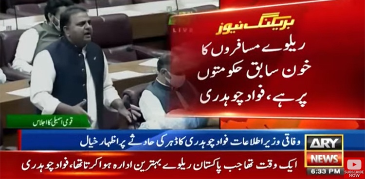 ڈہرکی ٹرین حادثے سے متعلق قومی اسمبلی میں اظہارخیال کرتے ہوئے فواد چوہدری نے کہا کہ ملت اور سرسید ایکسپریس ایک دوسرےکو کراس کررہی تھیں، دونوں ٹرینوں پرمجموعی طور پر 1388 مسافر سوار تھے، حادثے کی مکمل انکوائری کاحکم دے دیا گیا ہے حادثے سےپتہ چلتا ہےکہ برسوں سے غفلت کامظاہرہ کیا گیا۔