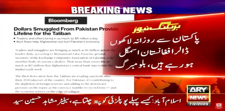 غیر ملکی جریدے بلومبرگ نے رپورٹ میں کہا ہے کہ پاکستان سے روزانہ لاکھوں ڈالر افغانستان اسمگل ہو رہے ہیں۔