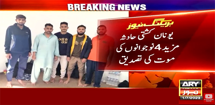 یونان کشتی حادثے میں مزید 4 پاکستانیوں کے جاں بحق ہونےکی تصدیق کر دی گئی۔ چاروں نوجوان دوست اور تعلق سرائے عالمگیر سے تھا۔