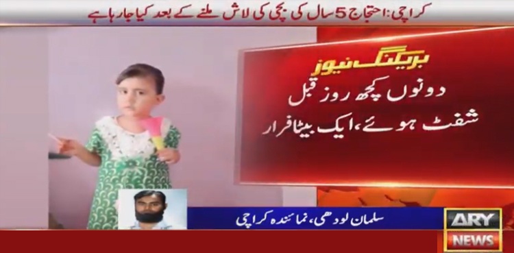 کراچی: شہر قائد کے علاقے پی آئی بی کالونی میں دو روز سے لاپتا 5 سالہ بچی مروا کی لاش ملنے پر اہلخانہ کا احتجاج جاری ہے، مظاہرین نے ملزمان کو گرفتار کرکے کیفر کردار تک پہنچانے کا مطالبہ کیا۔
