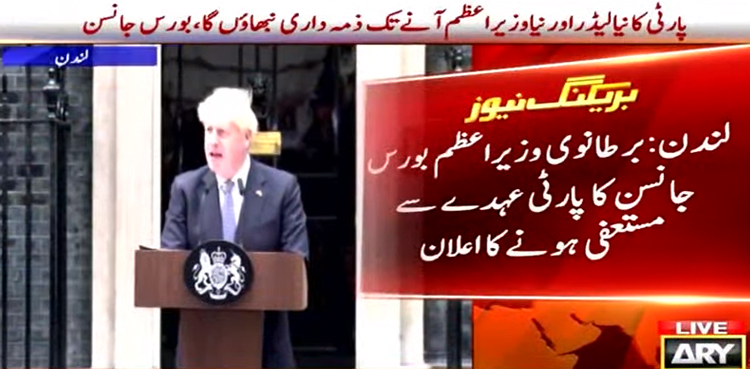 برطانوی وزیراعظم بورس جانسن نے ٹین ڈاؤننگ اسٹریٹ کے باہر میڈیا سے گفتگو میں اپنے عہدے سے مستعفیٰ ہونے کا اعلان کیا، انہوں نے کہا کہ پارٹی کا نیا لیڈر اور نیا وزیراعظم آنے تک ذمہ داری نبھاؤں گا، نئے لیڈر کو میری مکمل سپورٹ حاصل ہوگی۔