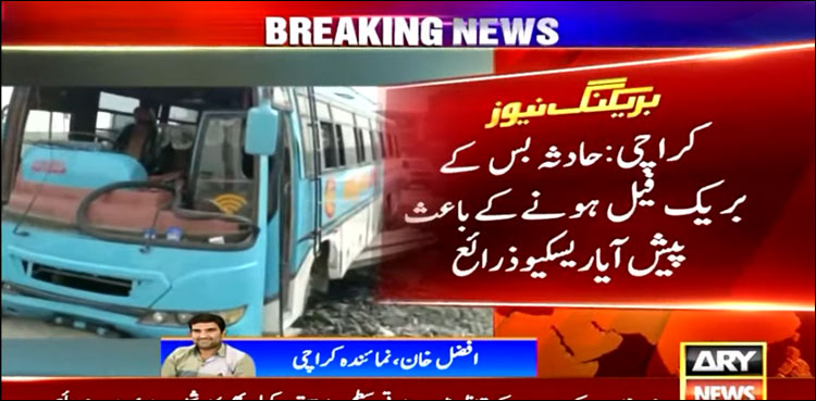 ریسکیو ذرائع کے مطابق حادثہ بس کے بریک فیل ہونے کے باعث پیش آیا، بس کو کرین کی مدد سے نکالا جا رہا ہے، جب کہ واقعے کے باعث اطراف کی سڑکوں پر ٹریفک جام ہو گیا۔
