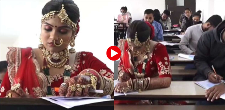 ایسی ہی ایک ویڈیو سوشل میڈیا پر وائرل ہورہی ہے جس میں ایک دلہن تعلیم حاصل کرنے کی جستجو میں مگن شادی کے روز ہی عروسی لباس میں شوہر کو ساتھ لے کر امتحان دینے پہنچ گئی۔