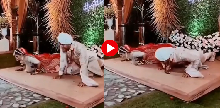 ایسی ہی ویڈیو سوشل میڈیا پر وائرل ہورہی ہے جس میں دلہا اور دلہن نے شادی کو یادگار بنانے کے لیے عروسی لباس میں ہی ’پش اپس‘ لگانا شروع کردیے۔