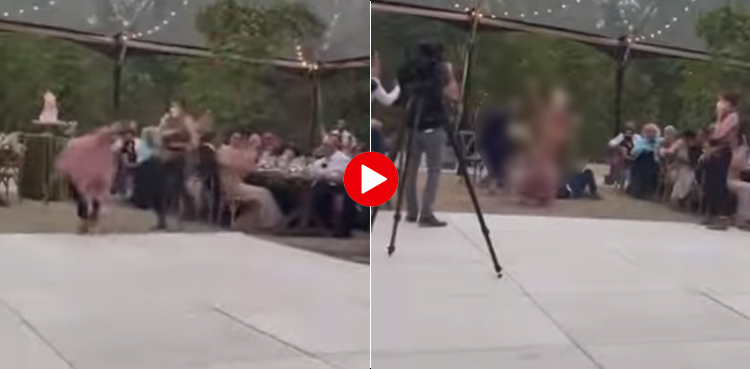 اسٹیج پر پہنچنے سے قبل ہی گرنے کے بعد بھی دلہن اور دلہا نے ہمت نہیں ہاری اور دوبارہ اٹھ کر رقص کرنا شروع کردیا۔