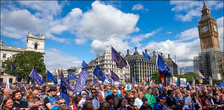 برطانوی میڈیا کے مطابق برطانیہ کا یورپی یونین میں واپسی کا مطالبہ زور پکڑنے لگا، برطانیہ کی یورپی یونین میں دوبارہ شمولیت کے لیے لندن کے شہریوں نے مظاہرہ کیا۔