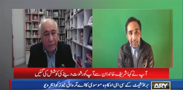 تفصیلات کے مطابق اے آر وائی نیوز کو دئیے گئے انٹرویو میں براڈشیٹ کمپنی کے سی ای او کاوے موسوی نے چشم کشا حقائق بیان کرتے ہوئے بتایا کہ شریف فیملی کی جانب سے انجم ڈار نے رشوت کی پیشکش کی، اس نے خود کو نواز شریف کا بھانجا یا بھتیجا ظاہر کیا اور ثبوت کے طور پر نواز شریف کے ساتھ اپنی تصاویر بھی دکھائیں۔