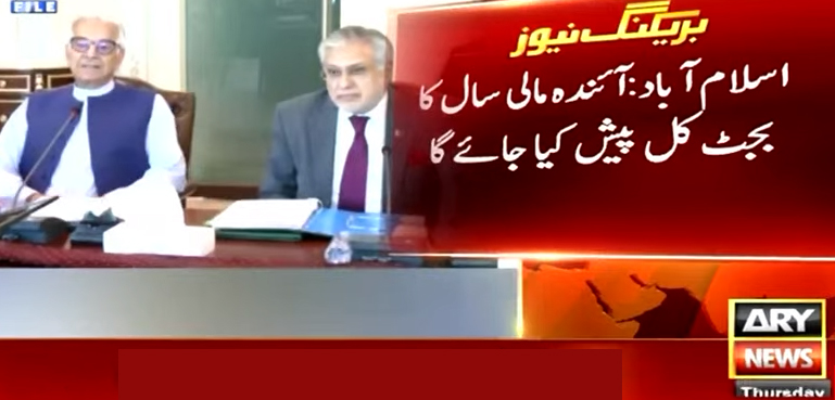 اے آر وائی نیوز کے مطابق آئندہ مالی سال کا بجٹ کل پیش کیا جائے گا۔ ذرائع کے مطابق بجٹ کا حجم 13 ہزار 800 ارب روپے سے زائد ہوگا۔ بجٹ کا خسارہ 6 ہزار ارب سے زائد ہوگا جب کہ 7300 ارب روپے قرضوں اور سود کی ادائیگی پر خرچ ہوں گے۔