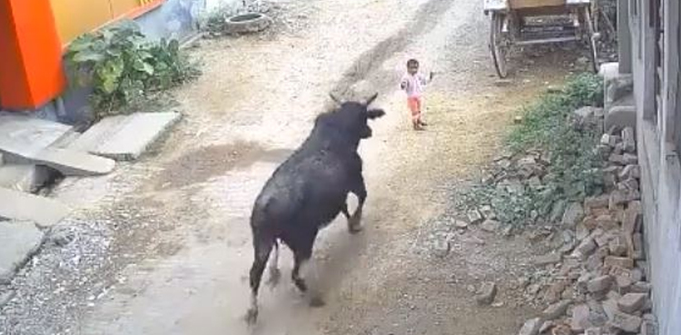 سوشل میڈیا پر اس دل دہلا دینے والے منظر کی سی سی ٹی وی فٹیج گردش کر رہی ہے جس میں گائے کو بچے پر حملہ آور ہوتے ہوئے دیکھا جا سکتا ہے۔