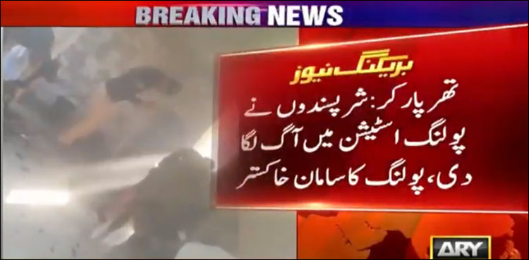 تفصیلات کے مطابق صوبہ سندھ کے ضلع تھرپارکر میں شرپسندوں نے پولنگ اسٹیشن پر دھاوا بول دیا، شرپسندوں نے پولنگ اسٹیشن میں آگ لگا دی اور سامان خاکستر کردیا۔