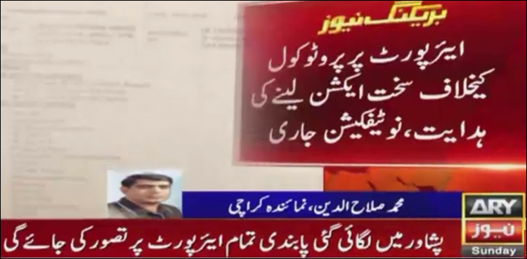 نمائندہ اے آر وائی نیوز صلاح الدین کے مطابق پشاور ایئرپورٹ پر سول ایوی ایشن کے سی او او عبید الرحمان کی زیر صدارت اعلیٰ سطح کا اجلاس ہوا جس میں ائیرپورٹ پر کسی بھی شخص کو پروٹوکول دینے والوں کے خلاف کارروائی کا فیصلہ کیا گیا۔