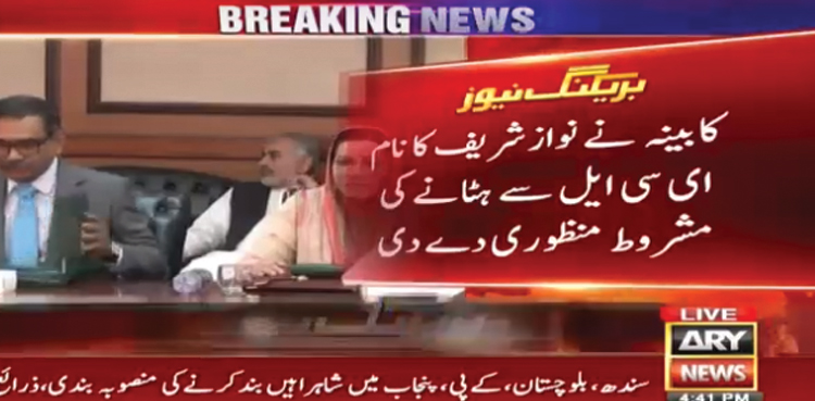 تفصیلات کے مطابق سابق وزیراعظم نوازشریف کا نام ای سی ایل سے نکالنے کی مشروط منظوری دے دی گئی ، مشروط منظوری وفاقی کابینہ کی جانب سے دی گئی ہے۔