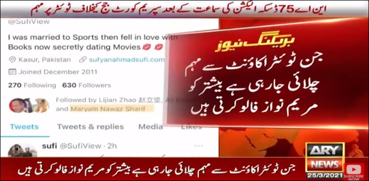 اے آر وائی نیوز کی رپورٹ کے مطابق سوشل میڈیا پر چلنے والی مہم میں بینچ میں شامل جج کے خلاف نازیبا زبان استعمال کی گئی، جن ٹویٹر اکاؤنٹ سے مہم چلائی جارہی ہے بیشتر کو مریم نواز فالو کرتی ہیں۔