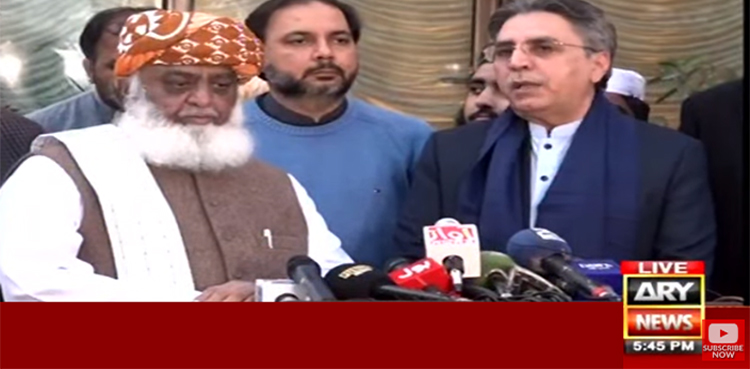 بعدازاں میڈیا سے گفتگو میں مولانا فضل الرحمان نے کہا کہ 4سال کی حکومت نے ثابت کیا ملک پیچھے کی طرف گیا ہے ملک کا بوجھ اٹھانا کسی کےبس کی بات نہیں حکومت کی اتحادی جماعتوں کو خیرخواہی کاپیغام دے سکتےہیں۔