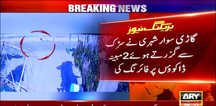 گزشتہ روز پیش آئے واقعے میں ایک کار سوار شہری نے سڑک سے گزرتے ہوئے 2 مبینہ ڈاکوؤں پر فائرنگ کی تھی، جس میں دیکھا گیا کہ گولی لگتے ہی ایک ڈاکو زمین پر گرا اور دوسرا بائیک چلاتا رہا۔