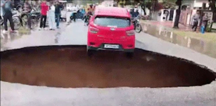 بھارت میں بارش کے بعد لکھنؤ کے رہائشی علاقے کی سڑک پر کار 20 فٹ کے بڑے گڑھے میں لٹکتی رہی۔