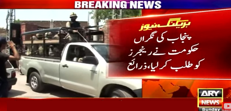 اے آر وائی نیوز کے مطابق پنجاب کی نگراں حکومت نے لاہور میں دفعہ 144 کے نفاذ کے بعد رینجرز کو بھی طلب کرلیا ہے۔ ذرائع کا کہنا ہے کہ صوبائی حکومت نے شہر میں کسی بھی ناخوشگوار واقعے سے نمٹنے کے لیے رینجرز کو طلب کیا ہے۔