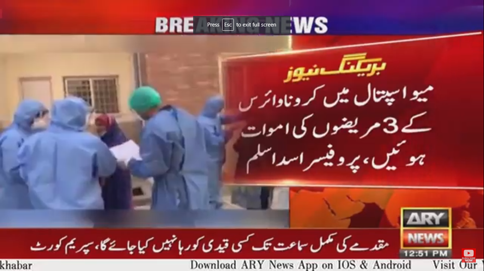 پروفیسراسداسلم کا کہنا تھا کہ 41سالہ مریض آئسولیشن وارڈ میں زیر علاج تھا , مریض کومیو اسپتال میں تشویشناک حالت میں لایا گیا تھا، مریض کا کوروناوائرس کا ٹیسٹ پازیٹو آیا تھا۔