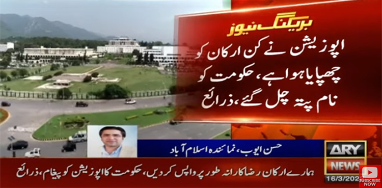 ذرائع نے انکشاف کیا ہے کہ تحریک عدم اعتماد سے پہلے اپوزیشن نے کچھ حکومتی ایم این ایز کو سندھ ہاؤس، اور فارم ہاؤس پر چھپا کر رکھا ہے، کچھ حکومتی ارکان کو اپوزیشن نے اپنے پارلیمنٹ لاجز میں بھی چھپا کر رکھا ہے۔