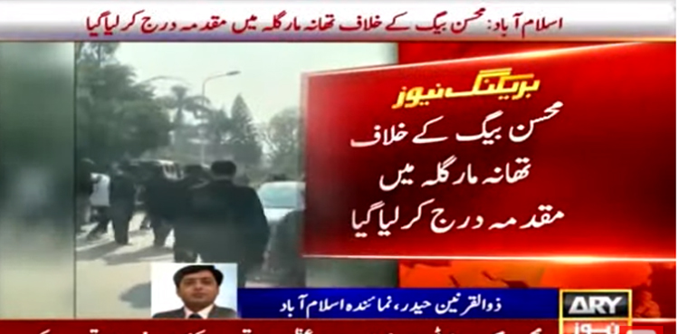 تفصیلات کے مطابق پولیس نے محسن بیگ کے خلاف تھانہ مارگلہ میں مقدمہ درج کرلیا، درج مقدمے میں دہشت گردی ودیگرسنگین دفعات شامل کی گئی ہے۔