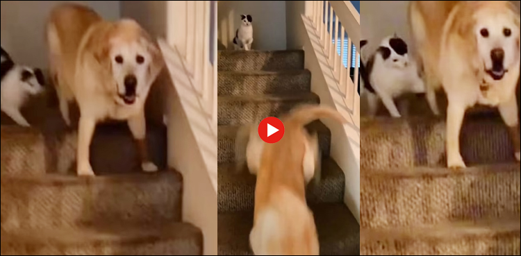 مختصر ویڈیو شیئرنگ پلیٹ فارم ٹک ٹاک پر ان دنوں ایک ایسی ہی دلچسپ ویڈیو وائرل ہورہی ہے، جس میں ایک بلی کو بوڑھے کتے کو سیڑھیوں سے دھکا دیتا ہوا دیکھا جاسکتا ہے۔