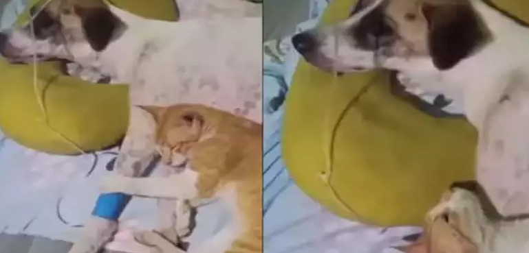 ویڈیو میں دیکھا جاسکتا ہے کہ کتا بستر پر لیٹا ہوا ہے اور اس کے ٹانگوں میں ڈرپ لگی ہوئی ہے جبکہ وہ کافی کمزور نظر آرہا ہے، اس کی دیکھ بھال کرنے کے لیے اس کے ساتھ ایک بلی بھی لیٹی ہوئی ہے۔