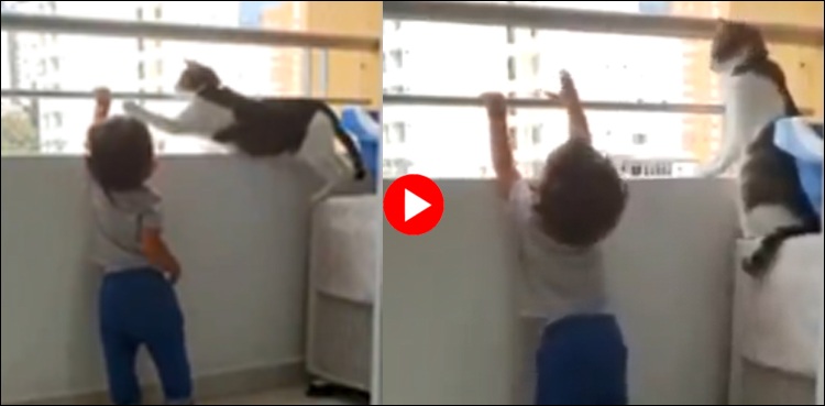انٹرنیٹ پر وائرل ہونے والی ویڈیو میں ایک بچے کو برانڈے میں جالیوں کے پاس کھڑا دیکھا جاسکتا ہے جبکہ اُس کے پاس ایک بکس پر بلی بھی بیٹھی ہوئی ہے۔