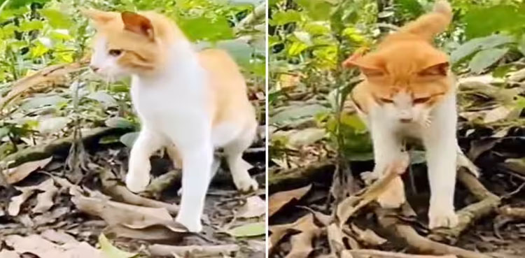 اس دوران بلی نے ناقابل یقین اور حیرت انگیز طور پر انتہائی پُھرتی کا مظاہرہ کرتے ہوئے سانپ کو ایک زوردار تھپڑ رسید کیا اور سانپ اگلے ہی لمحے زمین پر گر جاتا ہے۔