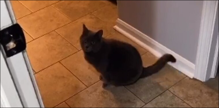 ویڈیو میں دیکھا جاسکتا ہے کہ جیسے ہی ایک شخص داخل ہوا تو بلی نے اُس سے پوچھا ’?Are You Comming‘ (کیا تم آرہے ہو؟)