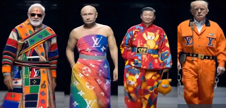 روسی صدر ولادیمیر پیوٹن، بھارتی وزیراعظم نریندر مودی، امریکا کے صدارتی امیدوار ڈونلڈ ٹرمپ، سابق صدر بارک اوباما، سابق وزیر خارجہ ہلیری کلنٹن، مارک زکر برگ، ایلون مسک، صدارتی امیدوار کمیلا ہیرس، بل گیٹس، چینی صدر شی جن پنگ، کینیڈین صدر جسٹن ٹروڈو، شمالی کورین رہنما کم جونگ ریمپ پر ماڈلز کی طرح کیٹ واک کرتے دکھائی دیے۔