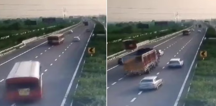 وائرل کلپ دیکھا جاسکتا ہے کہ تیز رفتار بس مصروف ایکسپریس وے پر بائیں جانب مڑتے ہوئے سڑک سے نیچی کی طرف گر رہی ہے، بس کو سڑک کے اطراف میں نصب ریلنگ سے ٹکرا کر گہرے گڑھے میں گرتے دیکھا جا سکتا ہے۔