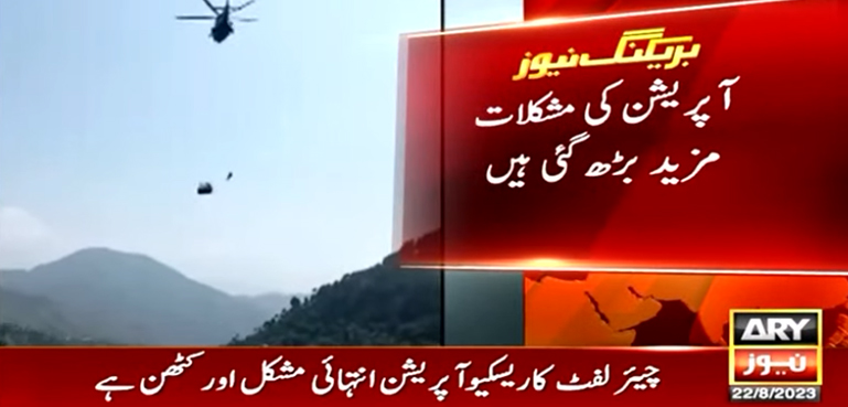 بٹگرام میں زمین سے ہزاروں فٹ بلندی پر چیئر لفٹ میں پھنسے 7 بچوں سمیت 8 افراد کو ریسکیو کرنے کے لیے پاک فوج کا آپریشن جاری ہے تاہم وقت گزرنے کے ساتھ مشکلات بڑھتی جا رہی ہیں۔