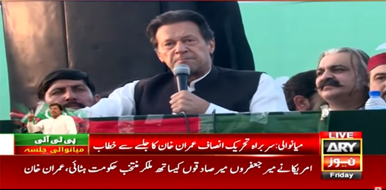 سابق وزیراعظم نے کہا کہ امریکا سے سازش شروع ہوئی، امریکا نے ہمارے میرجعفروں میر صادقوں کے ساتھ ملکر منتخب حکومت ہٹایا، چیری بلاسم کہتا ہے عوام کو غلامی کرنی پڑے گی، میں کہتا ہوں تم امریکا کے غلام ہو، ہم تو صرف اوپر والے کی غلامی کرتے ہیں، ہم محمدﷺ کی امت سے ہیں، کسی سپر پاور کے آگے نہیں جھکتے، ہمارے نبیﷺ نے ہمیں خودداری اور غیرت دی، قرآن میں اللہ نے کہا انسان کو اشرف المخلوقات بنایا ہے۔