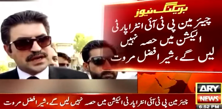وکیل شیرافضل مروت نے کہا ہے کہ چیئرمین پی ٹی آئی انٹراپارٹی الیکشن میں حصہ نہیں لیں گے۔