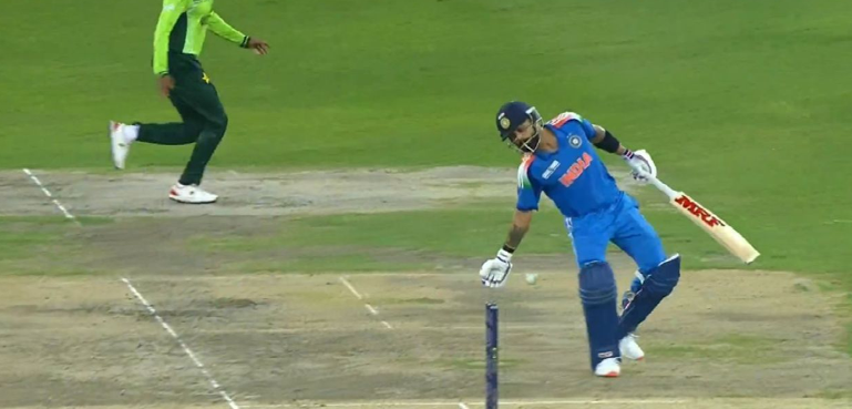 ویرات کوہلی نے حارث رؤف کی گیند پر تیز سنگل لینے کی کوشش کی لیکن کریز کے قریب پہنچنے کے بعد فیلڈر کی جانب سے تھرو کی گئی گیند کو جان بوجھ کر اپنے ہاتھ سے روک کر سب کو حیران کر دیا۔