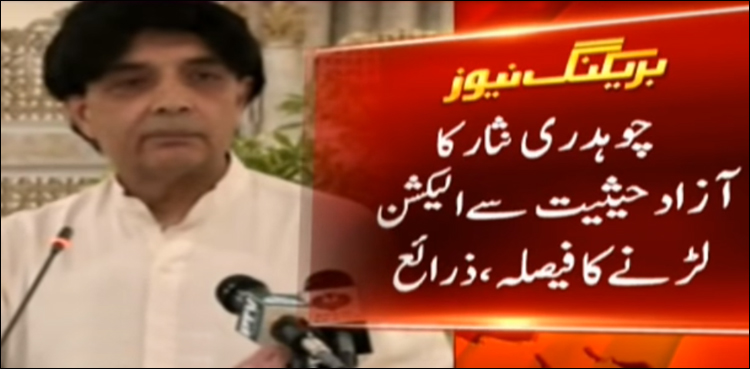 راولپنڈی: سابق وفاقی وزیر داخلہ اور ن لیگ کے ناراض رہنما چوہدری نثار نے خاموشی توڑتے ہوئے آزاد حیثیت سے الیکشن لڑنے کا اعلان کردیا۔