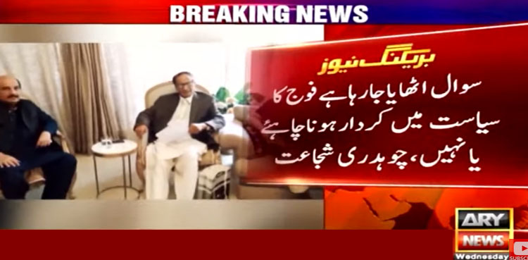 چوہدری شجاعت نے کہا کہ سوال اٹھایا جارہا ہے کہ فوج کا سیاست میں کردار ہونا چاہئے یا نہیں، سیاست کا ڈکشنری میں مطلب اصلاح احوال ہے اس کا مطلب سیاسی، معاشی، سماجی حالات درست کرنا ہے، ملکی سلامتی کیلئے لازم ہے فوج، حکومت باہمی اتفاق رائے سے فیصلہ کریں۔