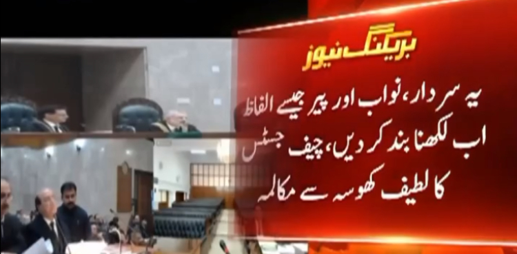سماعت کے دروان چیف جسٹس قاضی فائز عیسیٰ نے وکیل لطیف کھوسہ کے نام کے ساتھ سردار لکھنے پر برہمی کا اظہار کرتے ہوئے کہا کہ اپنے نام کے ساتھ یہ سردار، نواب اور پیر جیسے الفاظ اب لکھنا بند کر دیں۔