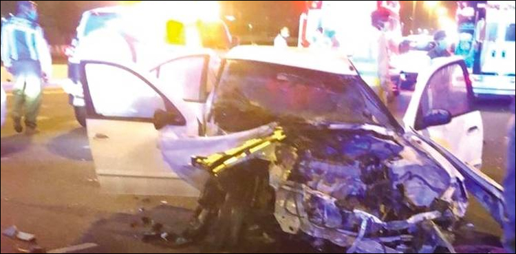 ڈرائیور نے تیز رفتاری میں اوور ٹیک کیا تو اچانک سامنے ٹرک آگیا، جسے دیکھ کر کار سوار کے اوسان خطا ہوئے اور پھر گاڑی ٹرک کے پچھلے حصے سے جاکر ٹکرائی۔